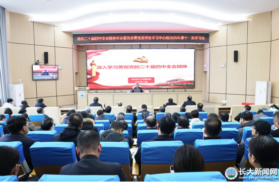 新闻网讯(记者 归航/文 刘健/摄)12月25日下午,学校举行党的二十届四中全会精神宣讲报告会暨校党委理论学习中心组2025年第11次(扩大)学习会。党委书记王建平以“深学笃行党的二十届四中全会精神 奋力谱写特色高水平大学建设新篇章”为题,从“凝心铸魂、举旗定向”“牢记嘱托、勇担使命”“实干笃行、乘势而上”三个维度,对党的二十届四中全会精神、湖北省委十二届十一次全会部署及学校“十五五”规划编制与实施作了系统阐释与深入解读。