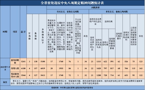 2025年第三季度,全省查处违反中央八项规定精神问题5241起,批评教育和处理6180人,其中,党纪政务处分5544人。